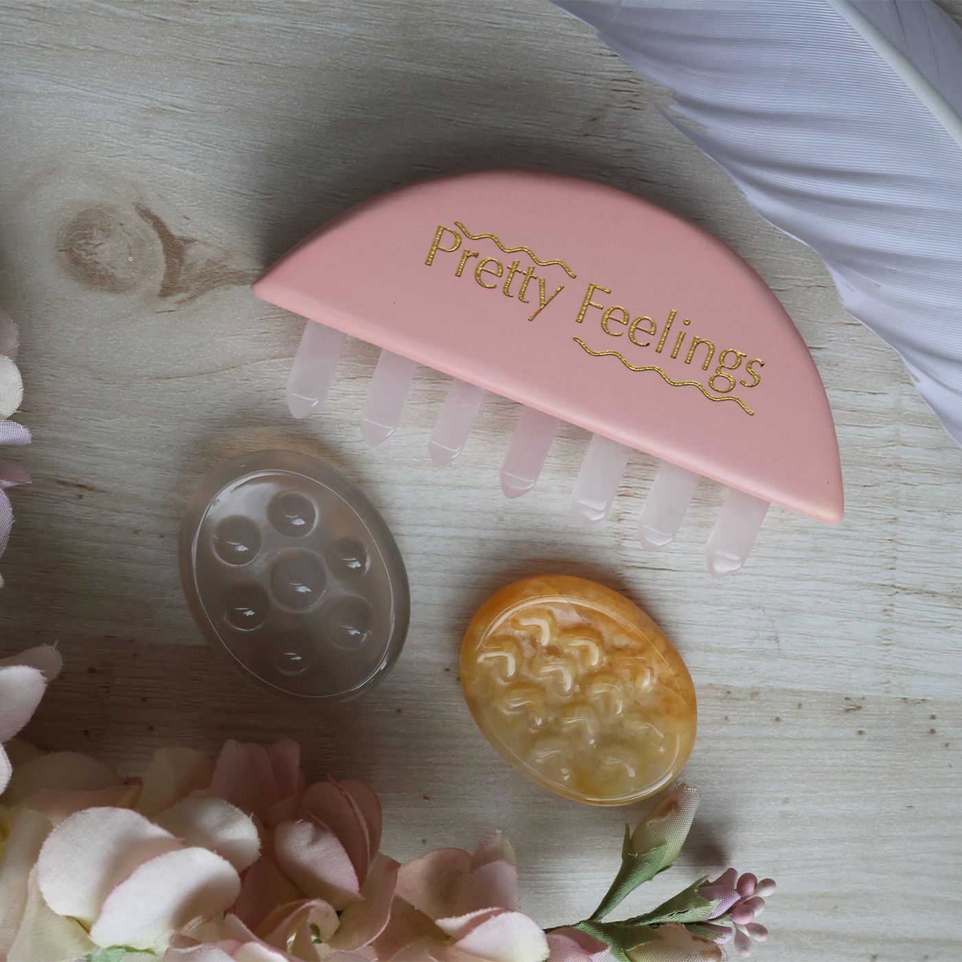 Pretty Feelings packs are curated to provide you with a tailored relaxation experience at a discounted price. Each pack contains one gemstone scratcher and two worry stones.